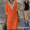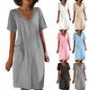 Ladies Lace Stitching V Neck Embroidered Exquisite Embroidered Lace Short Sleeve Cotton Linen Dress Summer Linen Dress